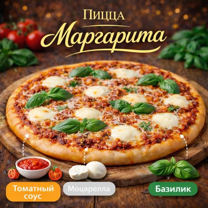 Пицца Маргарита — это классика, которая покоряет сердца любителей итальянской кухни по всему миру. Простая, но такая изысканная, эта пицца сочетает в себе идеальные вкусы: ароматный соус из спелых томатов, нежный растопленный сыр моцарелла и пикантные листочки свежего базилика. Всё, чтобы подарить вам незабываемое гастрономическое наслаждение!