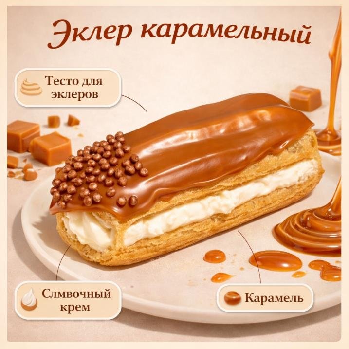 Наши карамельные эклеры приготовлены с особой любовью и вниманием к деталям. Воздушное тесто, созданное по классической технологии, идеально дополняется густым сливочным кремом с легкими карамельными нотками.