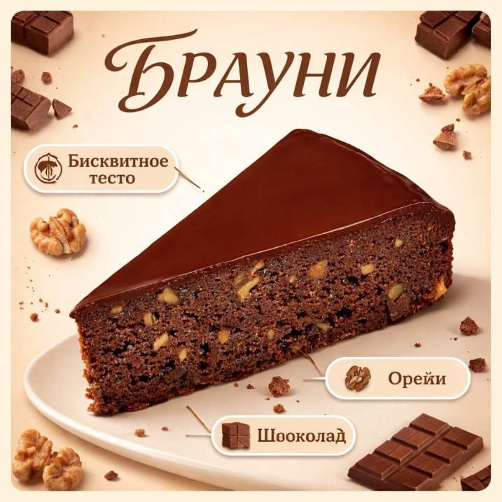 Торт Брауни — это ваш идеальный спутник для праздников, уютных вечеров или спонтанного угощения. Насыщенный шоколадный вкус и нежная текстура не оставят никого равнодушным!